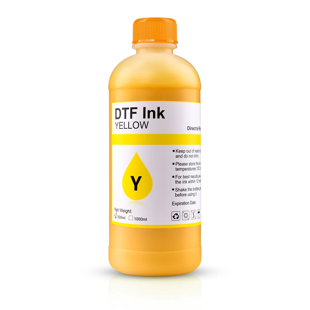 La Tinta para DTF 500 ml – Amarillo ofrece alta crominancia, flujo constante y excelente adhesión al trabajar con película PET y polvo hot-melt. Compatible con cabezales Epson Micro Piezo (L1800, L1300, R2400, L805, L800, P600, P800 y afines), aporta amarillos vibrantes que amplían el gamut y mejoran la definición de la transferencia.