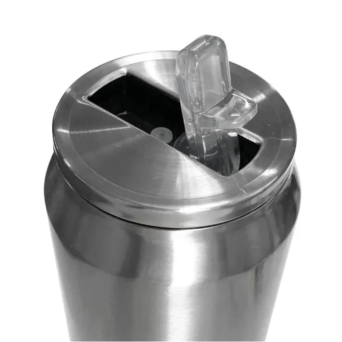 El diseño tipo lata integra una tapa hermética con pajilla/caña retráctil, ideal para beber cómodamente sin destapar y minimizar derrames en movimiento. Con dimensiones de 22 × 10 cm y un peso de 0.3 kg, es ligera, portátil y compatible con la mayoría de portavasos.